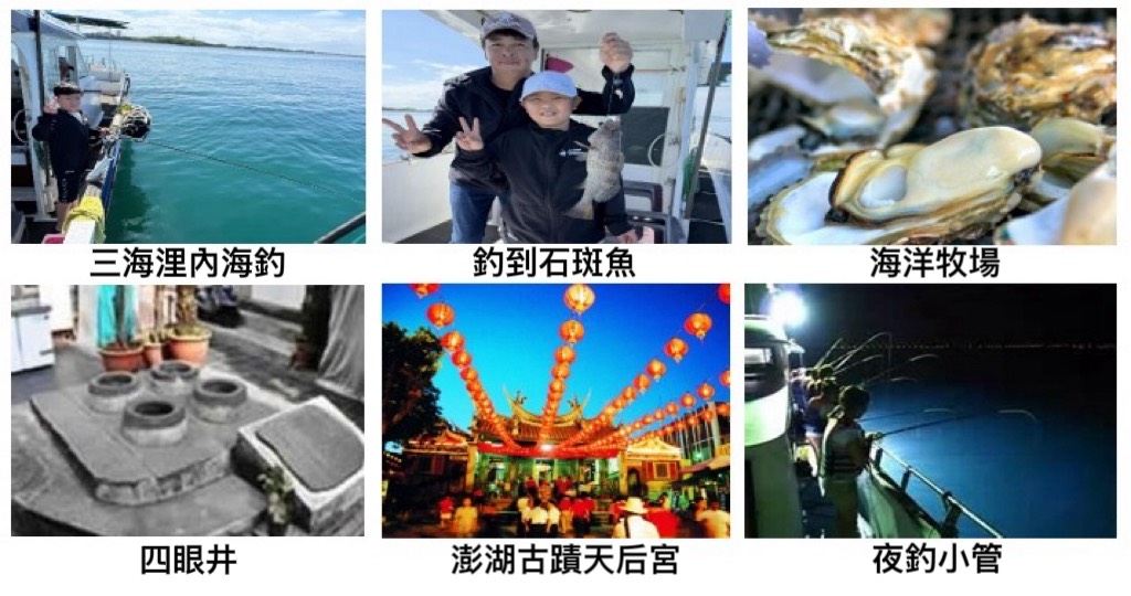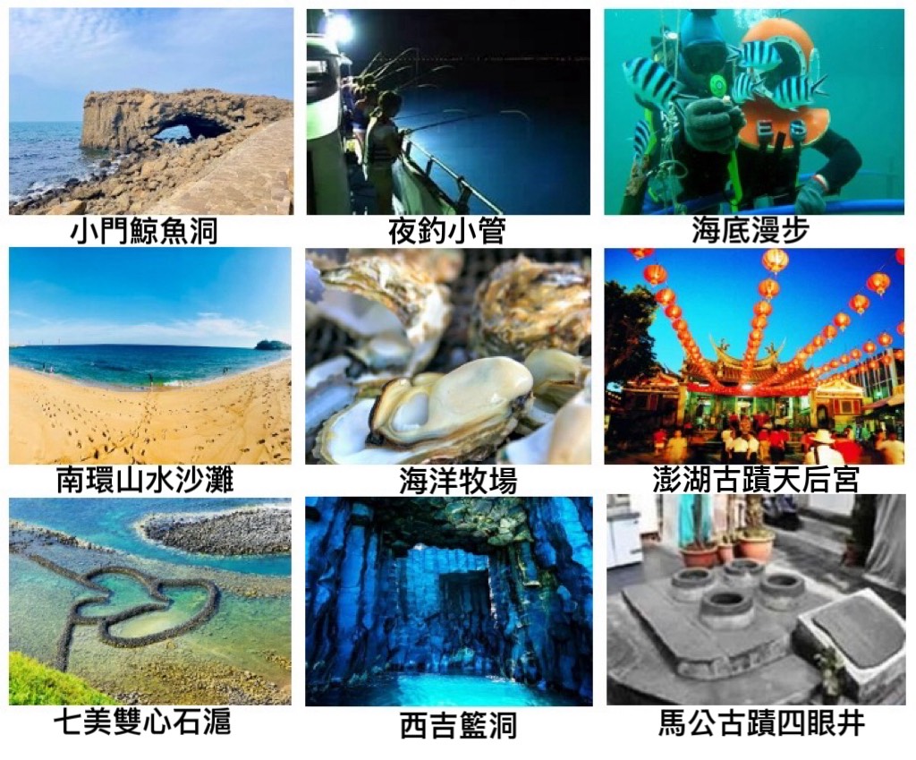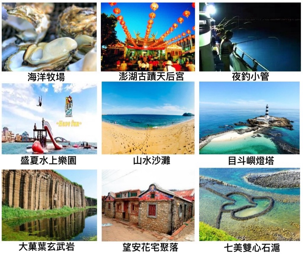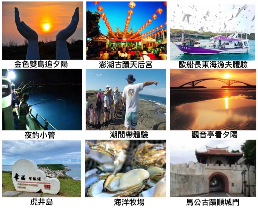 第三天:搭乘半潛艇出海 ( 船的下層結構為透明玻璃 ) 會帶各位前往看海底珊瑚礁,海上平臺烤牡蠣、海鮮粥吃到飽,平台上有給旅客體驗試釣養殖箱內的魚。馬公古蹟之旅 ( 400年開臺媽祖廟、張雨生館、潘安邦家 )