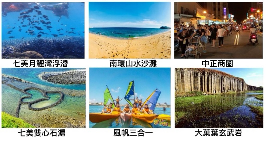 • 七美人塚(七美地名由來)• 七美燈塔• 望夫石• 月鯉戲水區• 石獅風景區• 牛母坪• 小台灣地形• 雙心石滬(澎湖最浪漫景點)