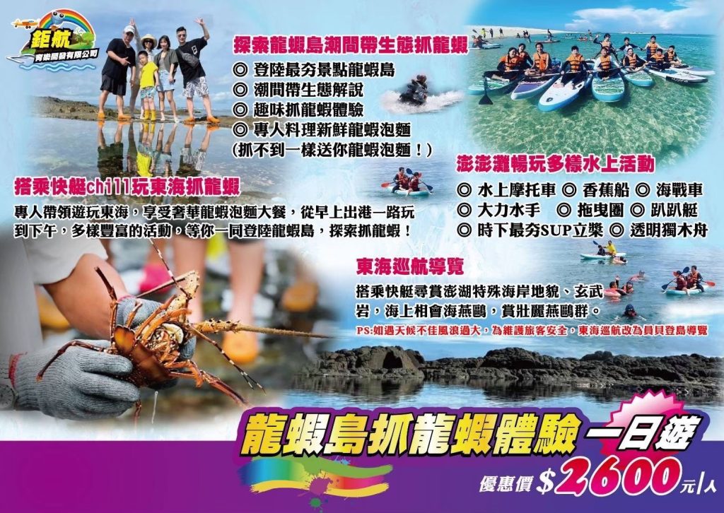 專人帶領遊玩東海,享受奢華龍蝦泡麵大餐,從早上出港一路玩到下午,多樣豐富的活動,等你一同登陸龍蝦島,探索抓龍蝦!