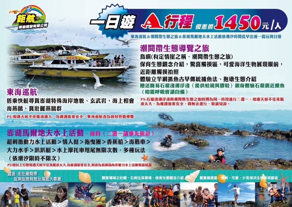 A行程 ( 包含A行程+C行程 ):【 東海巡航 】、【 八合一水上活動 VS 海釣(二選一)】、【 小朋友戲沙區、遊戲區 】、【 親臨島嶼摩西分海、踏浪浮潛餵魚秀、海田夢幻之旅 】