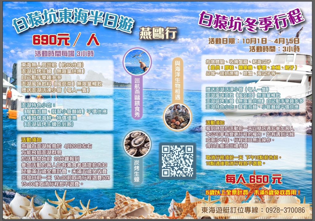 PS:如遇天候不佳風浪過大,為維護旅客安全,東海巡航改為員貝登島導覽